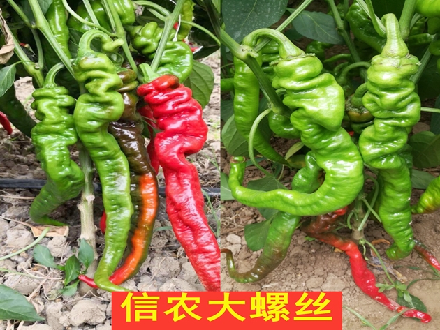 “信農大螺絲”《GPD辣椒(2019)410718》屬雜交種,中熟螺絲椒,果皮綠色,基部皺紋,青熟果淺綠色,老熟果果皮紅色;中抗病毒病CMV,中抗病毒病TMV,耐高溫,2014年進(jìn)行區域試驗,2015年進(jìn)行生產(chǎn)試驗,2016年進(jìn)行展示示范,并推廣種植,平均畝產(chǎn)6470千克,比對照金豐213增產(chǎn)4.82%。適宜在河南春季大棚種植。