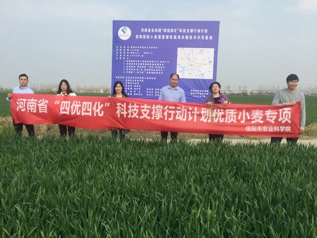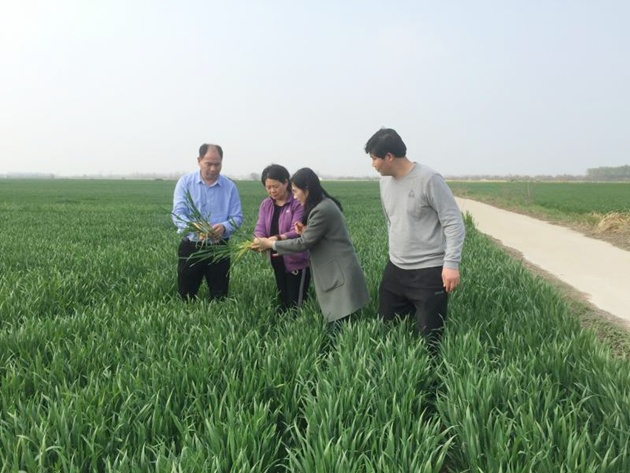 3月24日下午,河南省農科院土肥專(zhuān)家黃紹敏研究員,栽培專(zhuān)家邵運輝副研究員、汪慶昌博士,植保專(zhuān)家徐洪樂(lè )博士一行5人到信陽(yáng)市農科院示范基地調研指導弱筋小麥生產(chǎn)。