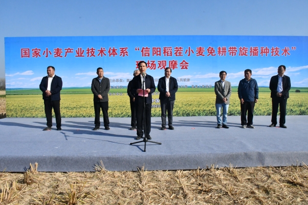 10月22日,由國家小麥產(chǎn)業(yè)技術(shù)體系、信陽(yáng)市人民政府主辦,我院、信陽(yáng)市農業(yè)農村局、息縣人民政府承辦,息縣宏升糧食制品有限公司協(xié)辦的國家小麥產(chǎn)業(yè)技術(shù)體系“信陽(yáng)稻茬小麥免耕帶旋播種現場(chǎng)觀(guān)摩暨技術(shù)培訓會(huì )”在息縣成功召開(kāi)。國家小麥產(chǎn)業(yè)技術(shù)體系首席科學(xué)家劉錄祥研究員、河南農業(yè)大學(xué)郭天財教授、信陽(yáng)市副市長(cháng)汪明君、院黨組書(shū)記李杰等出席會(huì )議。會(huì )議分現場(chǎng)觀(guān)摩和室內培訓兩個(gè)階段進(jìn)行,息縣縣委副書(shū)記、代縣長(cháng)鄭春,院長(cháng)鐘思志先后主持會(huì )議。